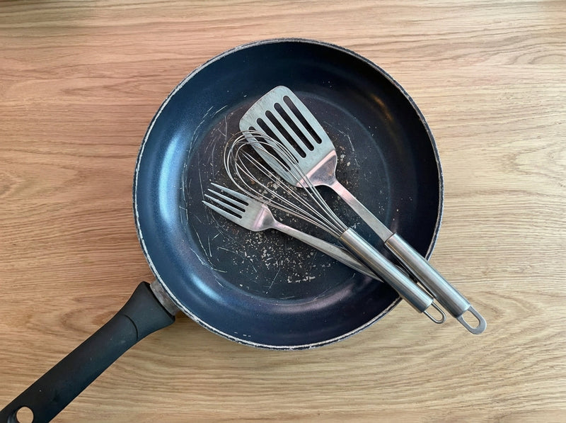 Alltägliche Küchenhelfer hinterlassen schnell Spuren. Pfannenwender und Zangen beschädigen die Oberfläche, sodass die Antihaftwirkung nachlässt und die Leistung deutlich sinkt.